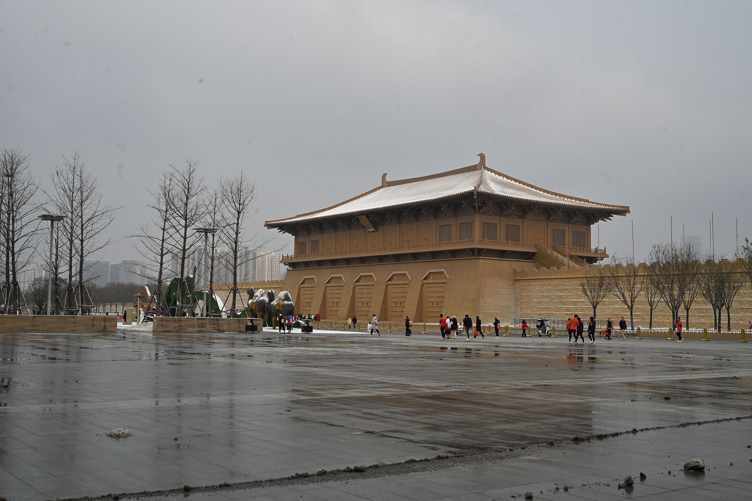 พระราชวังกู้กง สร้างขึ้นใหม่ (เพราะของเดิมเป็นไม้ ผุผังไปตามกาลเวลา - สร้างบนที่ตั้งเดิม สัดส่วนเดิม วัสดุแบบเดิม) สีพระราชวังไปไปตามภูมิประเทศ สังเกตดูด้านหน้าวังจะมีอูฐจำลองด้วย. |