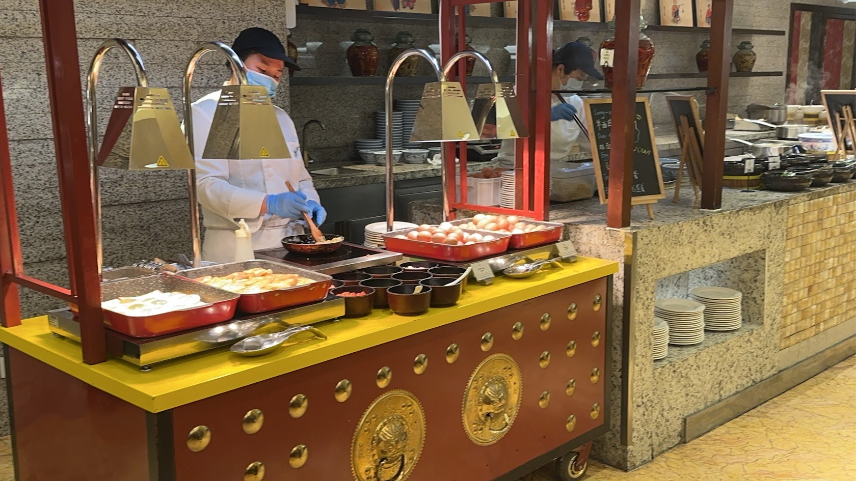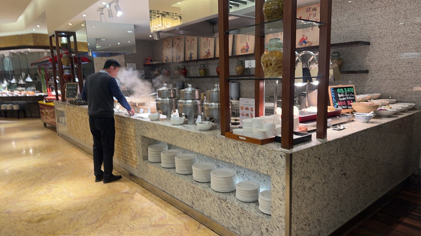 อาหารเช้าในโรงแรมเชอราตัน หรูมาก ดี สะอาด สด อร่อย เกาเหลาเนื้อแบบท้องถิ่นซีอาน หลู่เจียโหมว (เบอร์เกอร์แบบจีนใส่ใส้หมูหรือเนื้อสับปรุงรส) น้ำเต้าหู้ ออมเลต สลัดผักสด กาแฟสด อิ้วจ๋าก๊วย (ปาท่องโก๋) บ้านเรา ฯ ผมทานอาหารเช้าที่นี่ตลอด 5 วันไม่เบื่อเลย. |