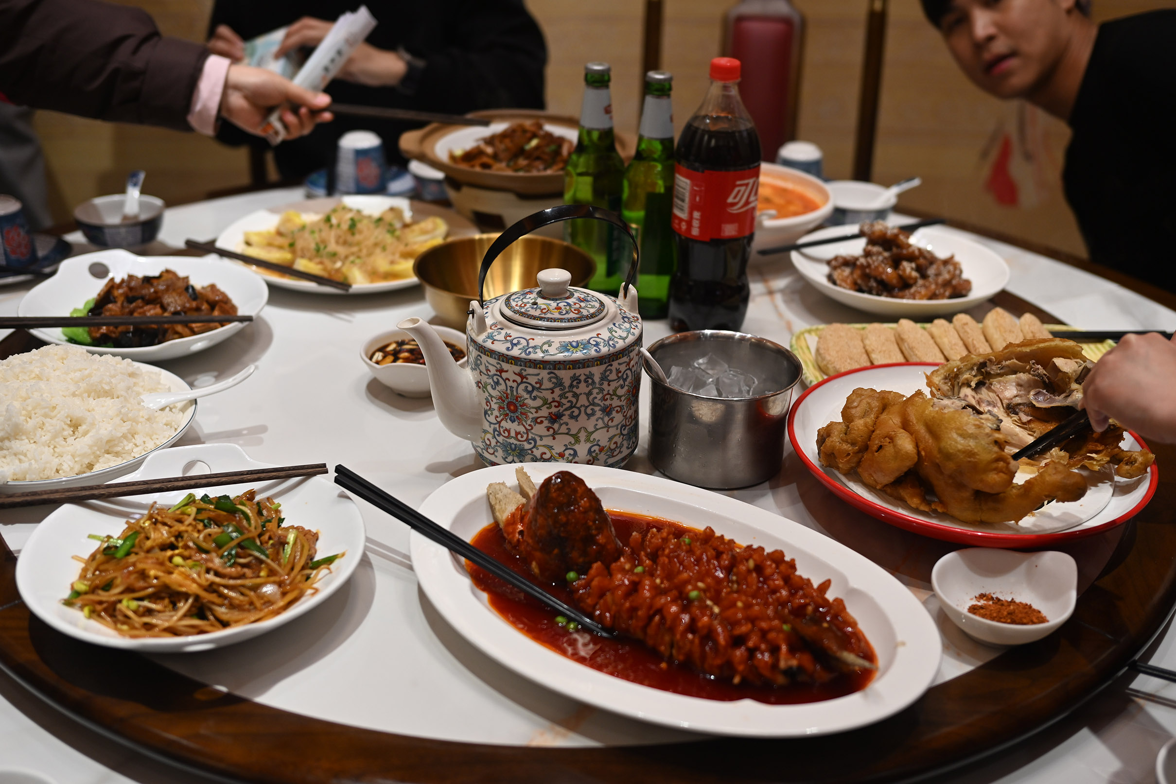 - รับประทานอาหารเย็นกันในภัตตาคารจีน โต๊ะจีน ทานกัน 7 คน อาหารเต็มโต๊ะอร่อยตามสไตล์ เลี่ยนนิด ๆ มีขนมปังกรอบข้างในกลวง โรยงาขาว อร่อยดี เหมือนอาหารที่คนจีนทำที่บ้านเราเมืองเราเมืองไทยเลย พอยิ่งค่ำคนยิ่งเยอะ ลมแรงพอควร หิมะตก เย็นจับใจ ต้องเดินระวังนิดหนึ่งกลัวลื่น.
