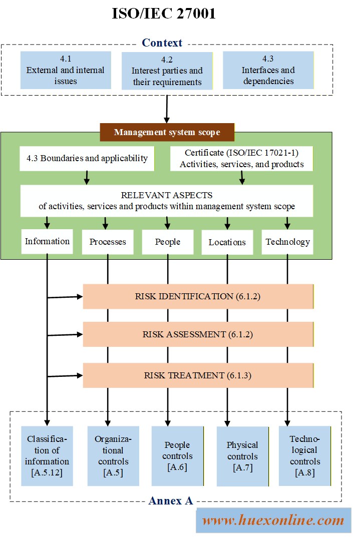 เหตุผลที่การกำหนดหมายเลขของการควบคุมในภาคผนวก ก. ของมาตรฐาน ISO/IEC 27001 เริ่มต้นที่เลข 5 แทนที่จะเป็นเลข 1 ก็คือ การควบคุมเหล่านี้มาจากมาตรฐาน ISO/IEC 27002 และครอบคลุมตั้งแต่บทที่ 5 เป็นต้นไป ดูภาพที่อยู่ติดกันเพื่อดูภาพรวมของความสัมพันธ์ระหว่างเอกสาร ISO/IEC ต่าง ๆ .