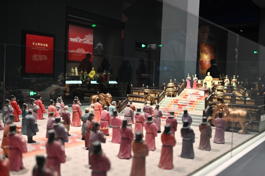Hero Image: แบบจำลองภายในท้องพระโรงราชวงศ์ถัง หวงตี้ต้อนรับคณะทูตานุฑูต พ่อค้าวานิช เหล่าทหาร เป็นต้น, ที่ถ่ายไว้เมื่อ 1 มกราคม 2569, แหล่งท่องเที่ยวจำลองในยุคราชวงศ์ถัง - บริเวณพื้นที่พระราชวังกู้กง, ซีอาน, สาธารณรัฐประชาชนจีน.