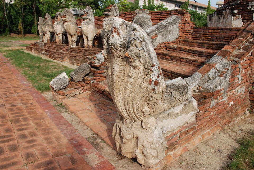 หลักฐานที่ได้จากการขุดแต่งพบว่า ฐานทักษิณสี่เหลี่ยม ขนาด 25*25 เมตร มีบันไดทางขึ้นลงทั้งสี่ด้าน ประกอบด้วยสิงห์ล้อม จำนวน 52 ตัวนี้ สร้างพอกทับประกบเข้าไปกับฐานเจดีย์ทรงแปดเหลี่ยมองค์ในที่หนึ่ง มิได้สร้างขึ้นมาในสมัยเดียวกัน ปัญหาที่ตามมาก็คือ ฐานทักษิณที่ประกอบด้วยบันไดนาคและสิงห์ทั้ง 52 ตัวนี้ สร้างขึ้นเมื่อใด.